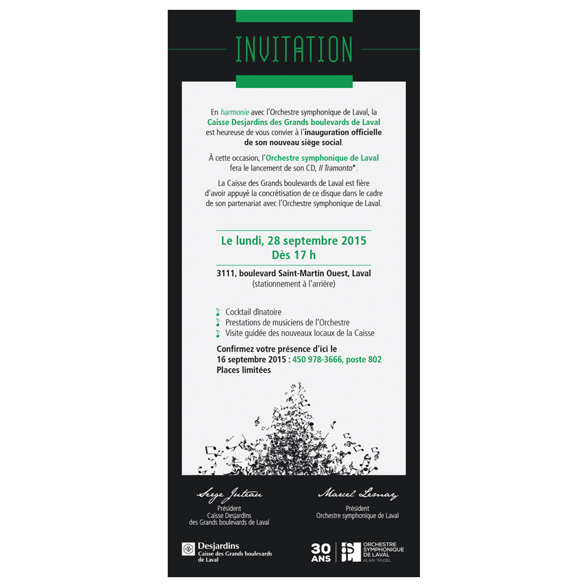 Caisse Desjardins des Grands boulevards de Laval Invitation pour l'inauguration officielle du nouveau siège social. ClientCaisse Desjardins des Grands boulevards de LavalDate de publication2015CatégorieProjets divers